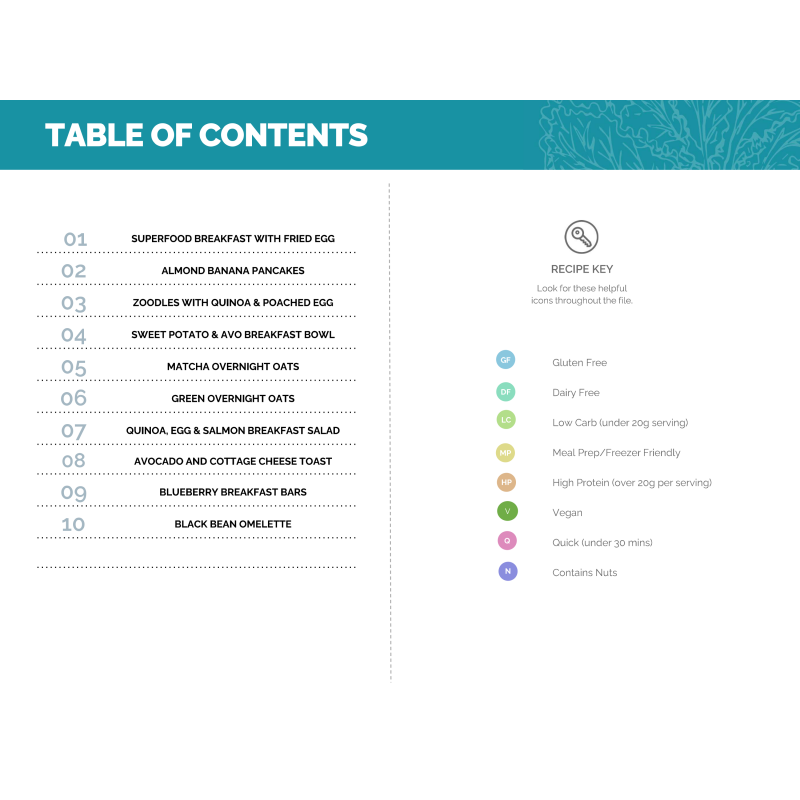 This is a pack of Vegetarian easy to make breakfasts, that include all the Carb, protein and fat breakdowns. Also, cooking and prep times, so you know how long to allow for them